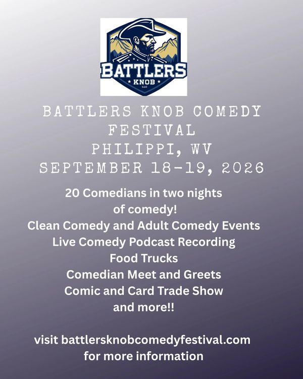 The 2nd Annual Battlers Knob Comedy Festival is hoping to be back September 18-19, 2026! The event will be held at Battlers Knob (formerly Alderson Broaddus University) in historical Philippi, WV! This will be a weekend of laughter and fun! Improv, Standup, Wrestling, vendors, and more! Come and be a part of history for the 2nd annual comedy festival in Philippi, WV!